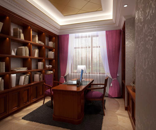 Description:Study, mahogany furniture, stately decor, retro European-style, interior space, 3D model