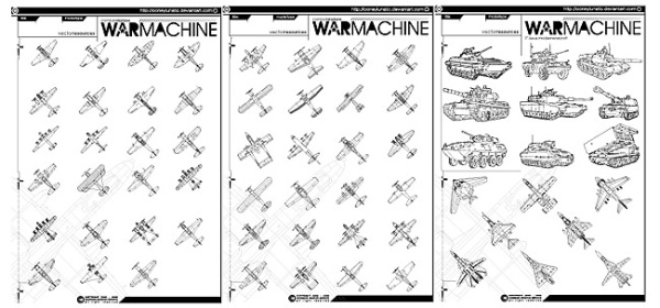 Description:Vector line drawing fighter planes and tanks, material