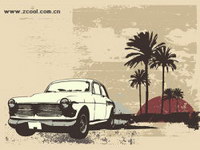 Retro-style cars coconut tree vector material